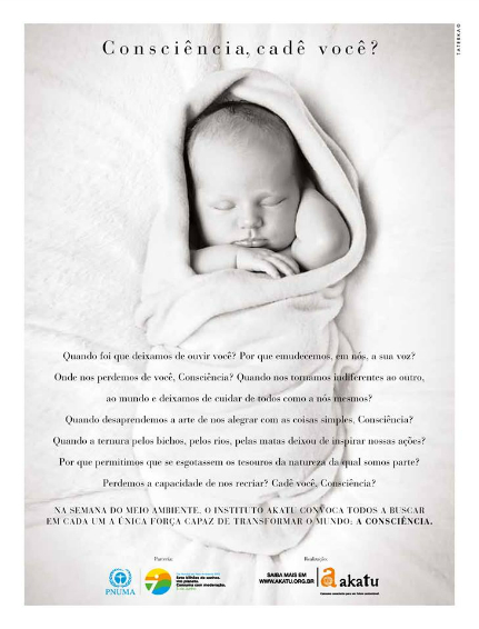 Com o objetivo de estimular uma reflexão na sociedade sobre o consumo consciente e promover o Dia Mundial do Meio Ambiente, comemorado nesta sexta-feira (05), o Instituto Akatu lança a campanha “Consciência, cadê você? ”. Com criação da DPZ&T, a ação convida as pessoas a resgatar em suas mentes, de forma retroativa, o processo de desencontro, quando o ser humano deixou de ouvir a consciência e começou a agir sem pensar no esgotamento dos recursos naturais e no coletivo.